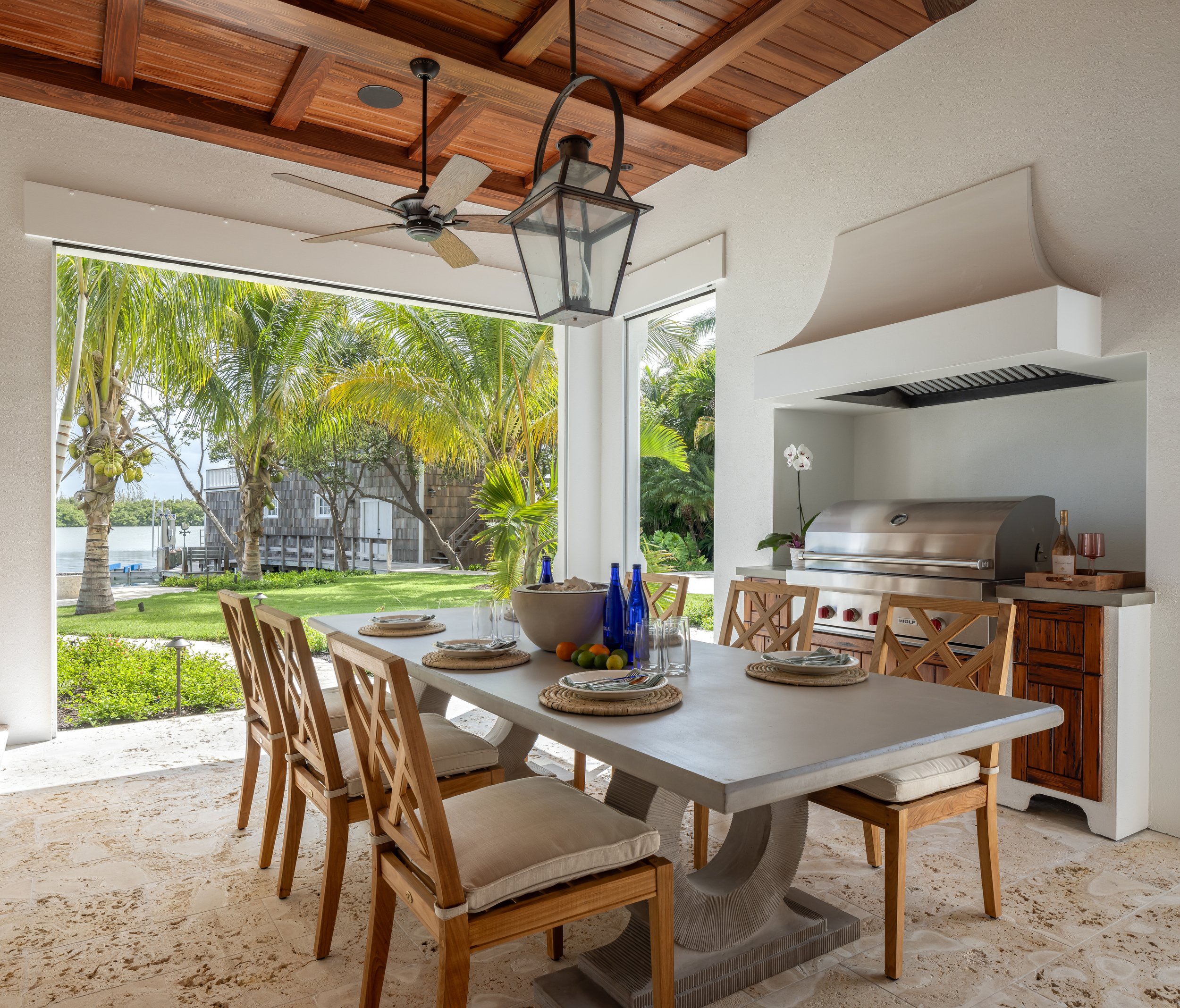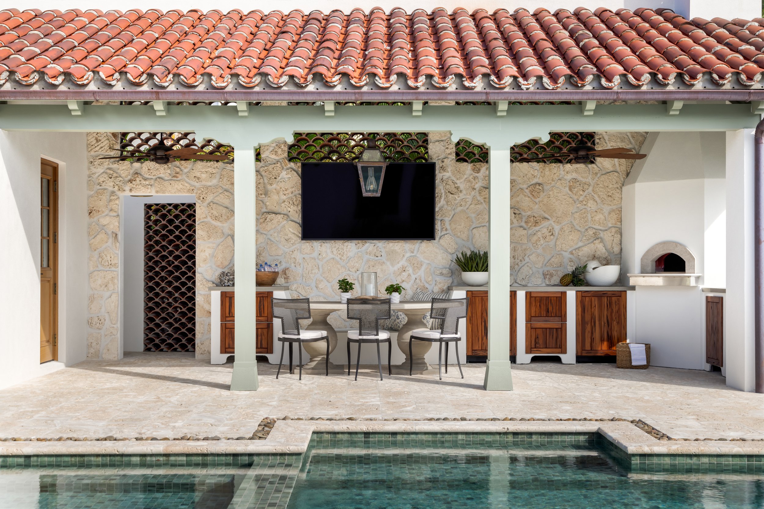Personal touches like wood plank ceilings, tropical landscaping, and comfortable bar seating turn your outdoor kitchen into an inviting space everyone wants to gather around.